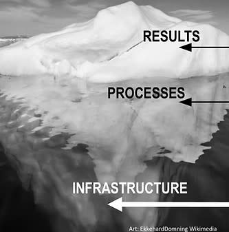 I harken back to a thinking model that has helped me design business solutions. It can easily be visualized using the well-worn “iceberg” metaphor. What you see above the surface of the ocean are the Results that an organization is after. That big mass underwater in this case consists of two layers: first, Processes and below that Infrastructure. As you might have guessed, Infrastructure is the foundation upon which Processes that get the Results are built.