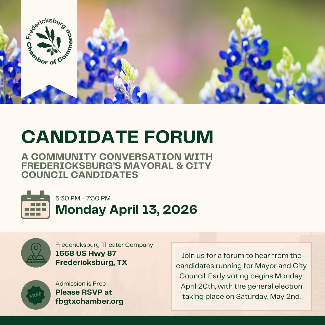 Join us for a forum to hear from the candidates running for Mayor and City Council in Fredericksburg. The event will take place at the Fredericksburg Theater Company, beginning at 5:30 PM. Chamber members will receive an email in advance with the opportunity to submit questions for consideration.