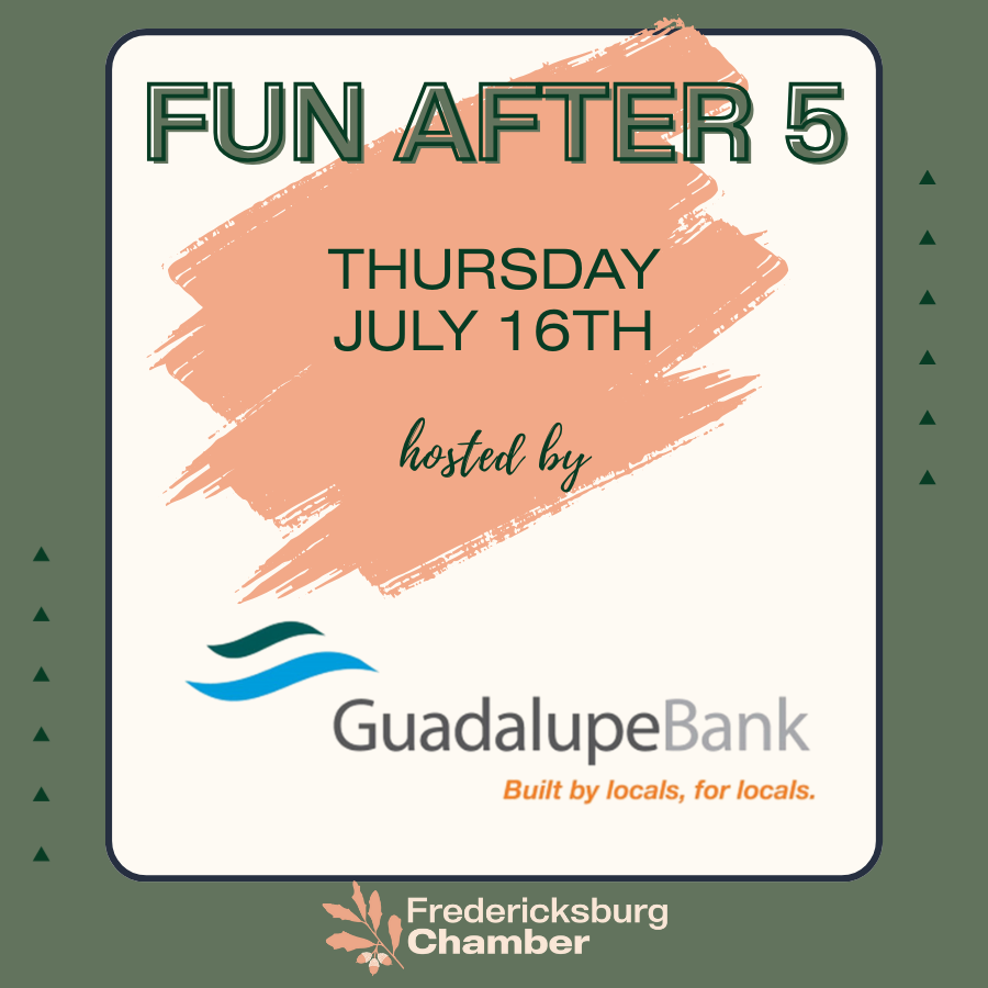 Our July Fun After 5 will be hosted by Guadalupe Bank. Join us for food, drinks and of course, networking! More details to come - stay tuned. For questions about exhibiting this event, please contact Candice at candice@fbgtxchamber.org.