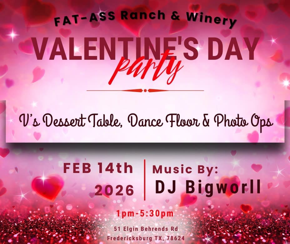Valentine’s Day Party at the Winery ❤️🍷 Join us for our annual Valentine’s Day celebration filled with wine, music, and all the love! Enjoy sweet treats from V’s Dessert Table, serving up Valentine’s-themed desserts and snacks, while DJ Big Worll keeps the vibes going from 1:00–5:30 PM. Our dance floor will be open, so come ready to sip, dance, and celebrate. We’ll be adding extra sparkle to the day with glitter drinks in festive Valentine’s colors for every glass of wine ordered, plus photo-worthy moments with a brand-new themed backdrop. Grab your favorite person (or your whole crew) and come celebrate love, Fat Ass–style. 💕✨ https://fatassranch.com/upcoming-event/winery-valentines-day-party/?mc_cid=1ab0370e19&mc_eid=822e75a3df