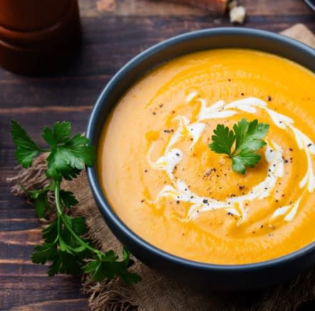Chef: Stella Karp Menu • Ancho–Butternut Squash Soup • Pork Tenderloin Stuffed with Herbs and Capers • Garlic Smashed Potatoes • Roasted Asparagus • Triple Berry Streusel Tart