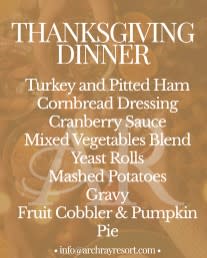 We want to welcome you this Thanksgiving Day to enjoy your holiday at Arch Ray Resort! Seating is limited, so be sure to reserve your spot in advance. Purchase your tickets and choose your preferred time frame. Your selected time frame indicates your preferred seating hour. Your specific reservation time will be confirmed via email, as exact seating times are dependent upon availability. Gather your family and spend the day with us at Arch Ray Resort.